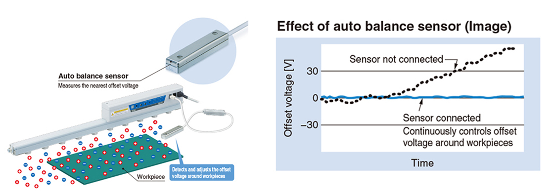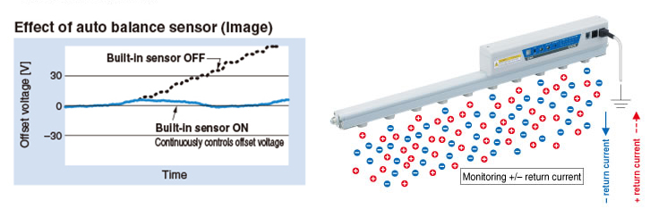 The offset voltage (ion balance) in the static neutralization area is controlled so that the voltage is maintained at a constant value. This is achieved by monitoring the ions emitted from the ionizer using the ground line and adjusting the + and - ion supply rates.