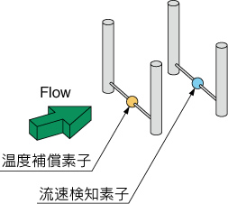 サーミスタは熱を奪われることで抵抗値が上昇しますが、上昇率は流体の流速と一意的な関係があるので、この抵抗値を計測することによって流速を検出できます。さらに流体温度や周囲温度を補償するために温度センサも内蔵されていますので、使用温度範囲内では安定した測定ができます。
