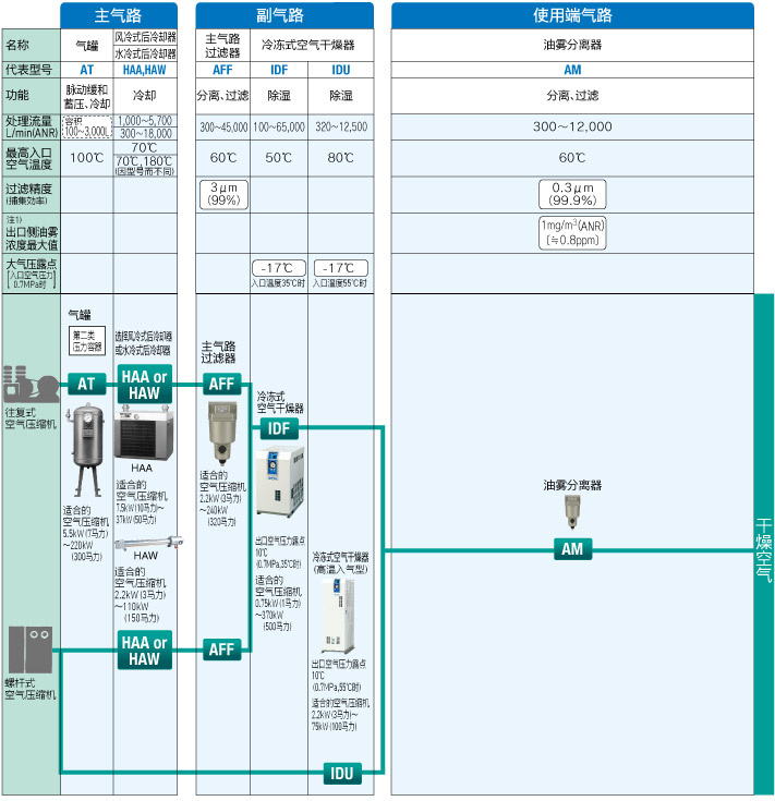 注2)根据ISO8573-1:2010(JIS B8392-1:2012)的压缩空气品质等级(参考上表),它是系统可得到的最高品质等级。实际会因入口空气条件而不同。