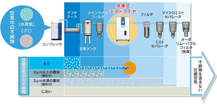 圧縮空気の中には水分(水蒸気、水滴)、油分、ゴミなどの異物が含まれています。 水滴、油分、ゴミなどはフィルタ、ミストセパレータ等で除去しますが、水蒸気はドライヤで除去する必要があります。