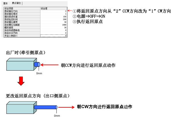 请更改“返回原点方向”的参数。标准产品在出厂时的默认值是“2”CCW方向。请将其改为“1”CW方向。 改变返回原点方向后,可移动范围也将改变,因此务必要修改“基本参数”的“行程(+)”、“行程(-)”的值。而且,也要根据新的可移动范围修改步骤数据。 ※必须重新接通电源,使设置有效。