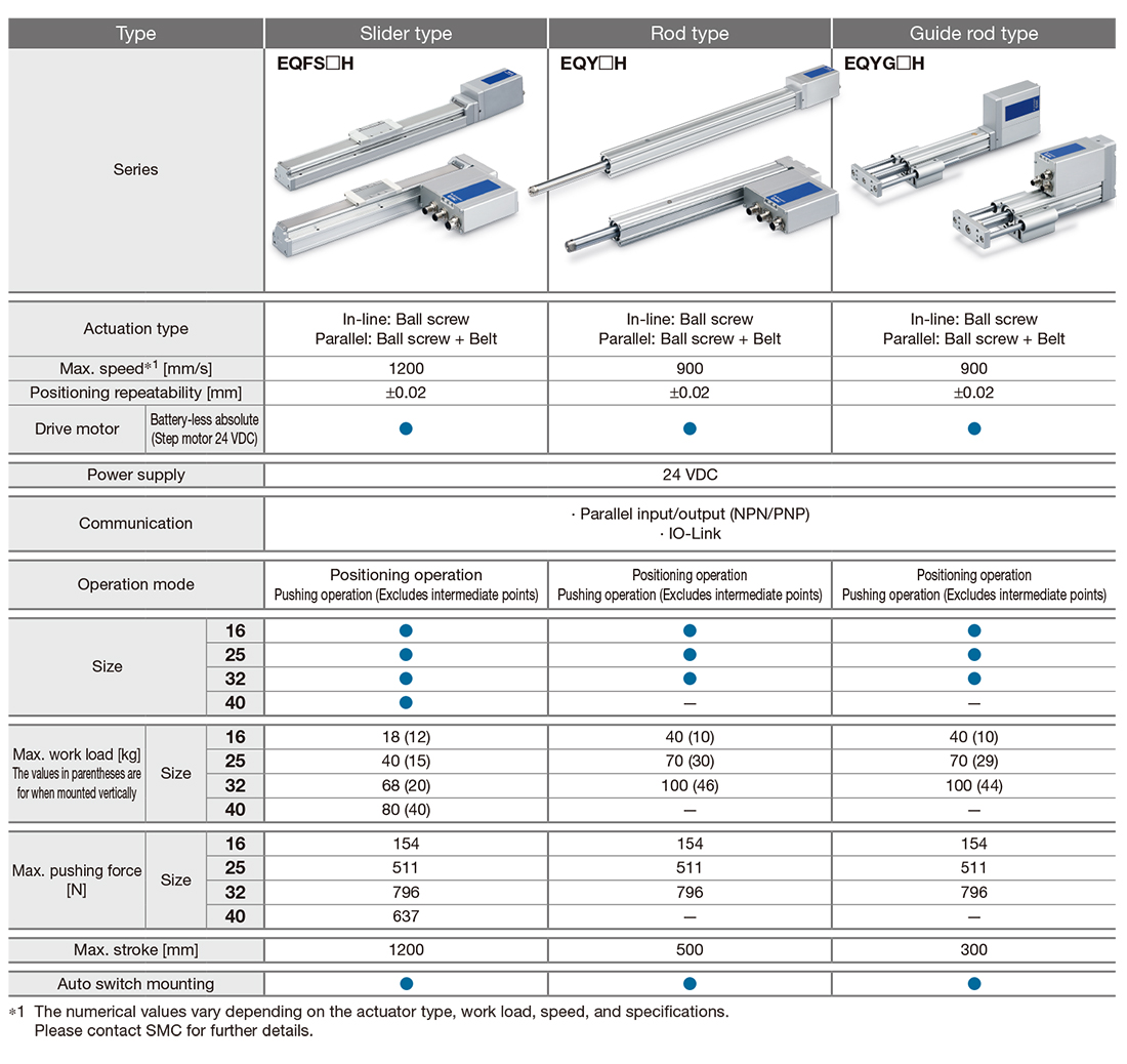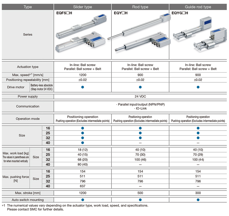 Battery-less absolute (Step motor 24 VDC) | EQY25□H | 30 to 400 | MAX. 452 | MAX. 900 | 3, 6, 12, 20 |