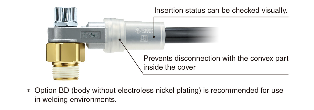 | Metal body, Elbow type | ASB-D | M5×0.8 10-32UNF R,G,NPT 1/8 to 1/2 | φ4 to φ12 | φ5/32'' to φ1/2'' |