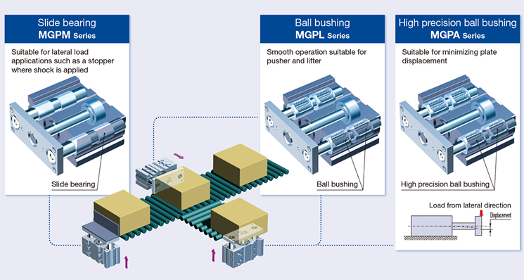 With air cushion | Slide bearing/Ball bushing/High-precision ball bushing | MGP-AZ | 16,20,25,32,40 50,63,80,100 |