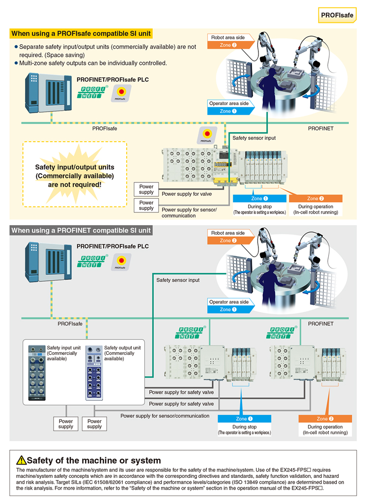 The EX245-FPS□ is equipped with safety inputs. The safety inputs of this product can connect to components (e.g. laser scanners, light curtains, etc.) that are compatible with the safety inputs.