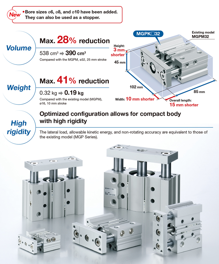 | Basic type | Slide bearing | MGPK | Double acting | 6,8,10,12,16,20,25,32,40,50 |