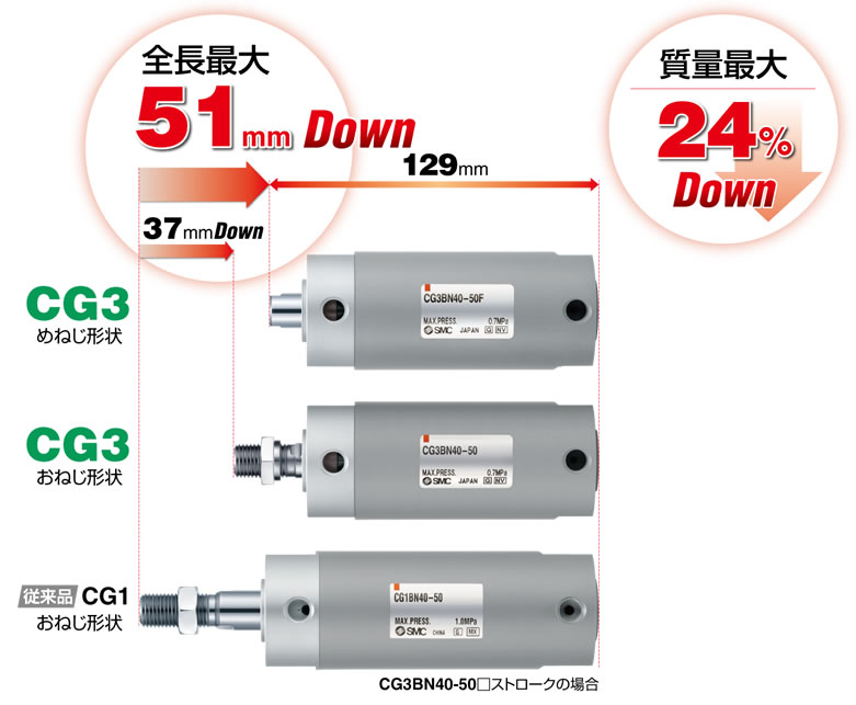 ・全長を最大51mm短縮、質量最大24%削減。(CG1との比較)