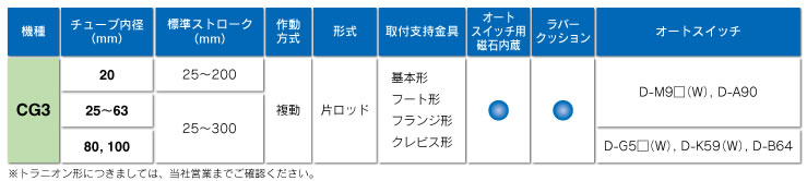 | 標準形 | CG3 | 複動片ロッド | 20,25,32,40,50,63,80,100 |