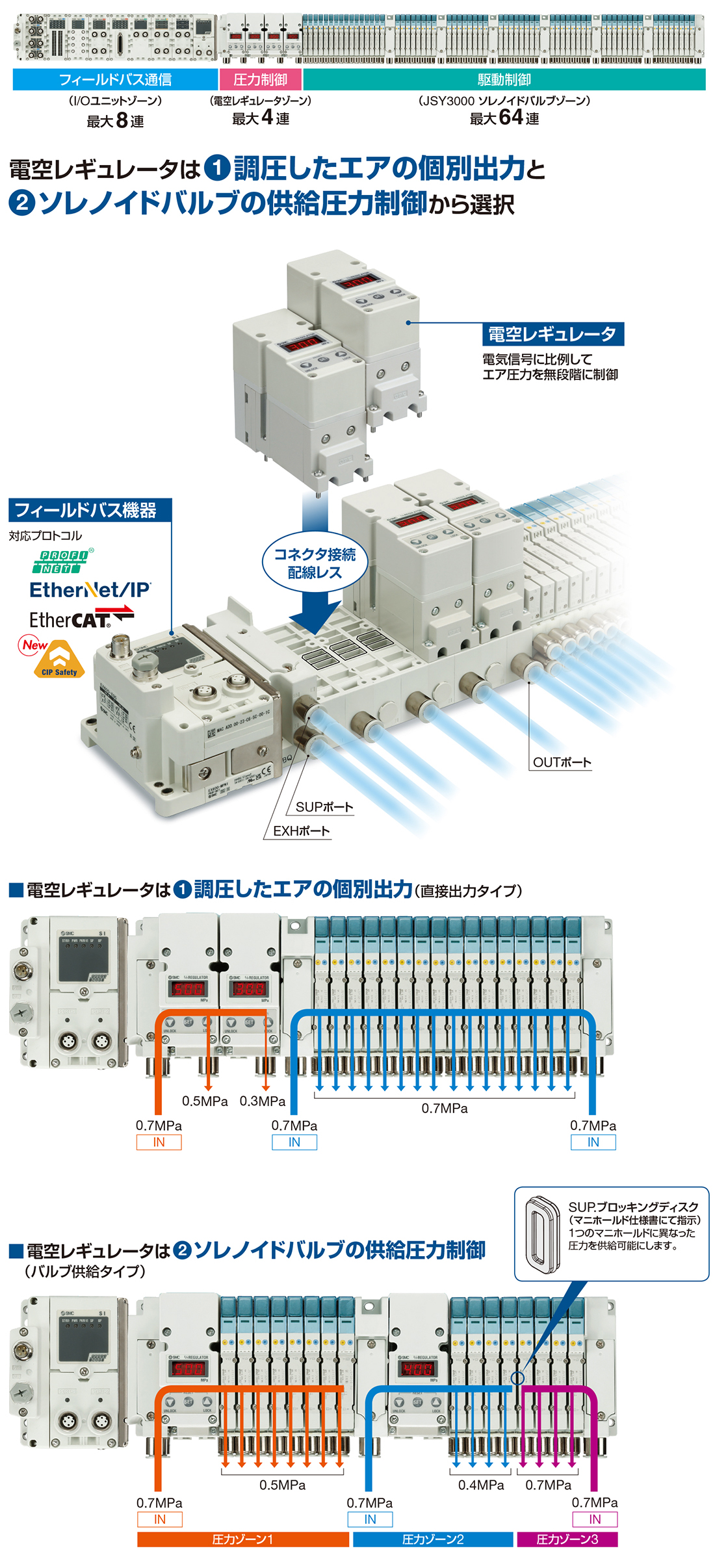 | JSY3000-P | IP65 | PROFINET EtherNet/IP™ EtherCAT | SIユニット:EX600 バルブ:JSY3000 電空レギュレータ:ITV2340 |