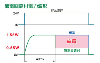 保持の無駄な電力を削減することにより、消費電力を標準に対して約1/3に低減しました。(定格電圧DC24V印加時、40msを超える通電時間で効果を示します。)下記電力波形をご参照ください。