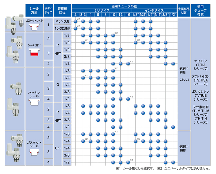 | タイプ | シリーズ | シリンダ側 接続口径 | 適用チューブ外径 ミリサイズ | 適用チューブ外径 インチサイズ |