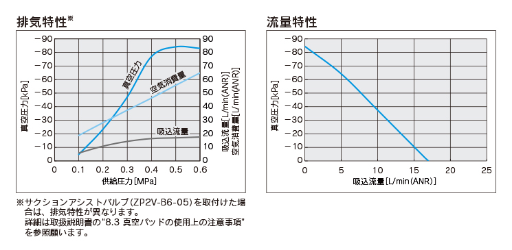 | シリーズ | パッド形状 | パッド径 | 吸込流量 [L/min(ANR)] | 空気消費量 [L/min(ANR)] |