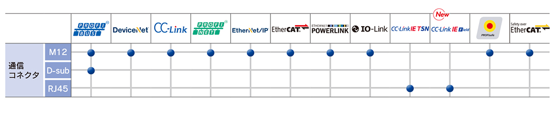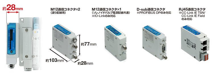 | EX260 | IP67 | DeviceNet®、PROFIBUS DP、CC-Link、EtherCAT、PROFINET、EtherNet/IP™、Ethernet POWERLINK、IO-Link(SY、JSY、VQCのみ対応)、CC-Link IE TSN、CC-Link IE Field、PROFIsafe(SY、JSY、VQCのみ対応)、Safety over EtherCAT® | SY3000/5000/7000(プラグイン)、JSY1000/3000/5000、VQC1000/2000/4000/5000、SV1000/2000/3000、S0700(IP40) |