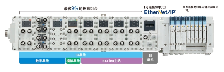 可将数字单元、模拟单元、IO-Link主站单元混合在一起,最多可连接9位,可按不同顺序连接。