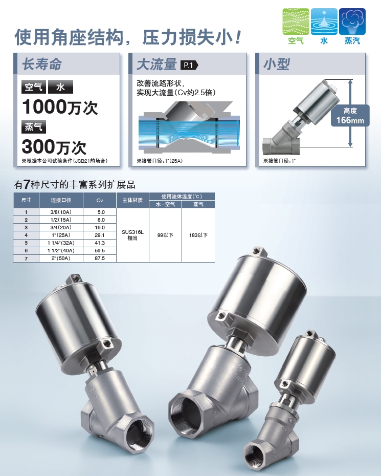 ・长寿命:1000万次(空气、水)、300万次(蒸气)