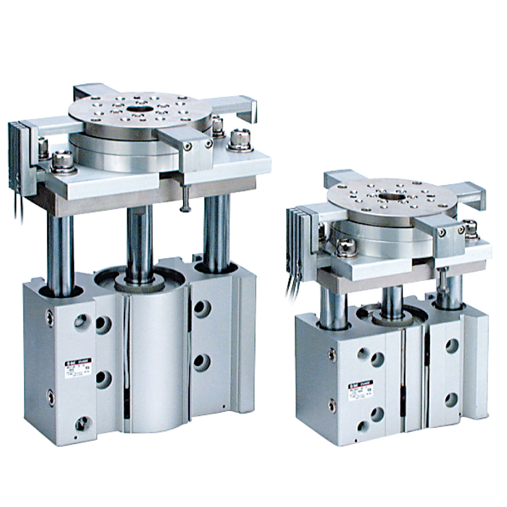 ・将带导杆的薄型气缸(MGP)与手动型转台一体化。